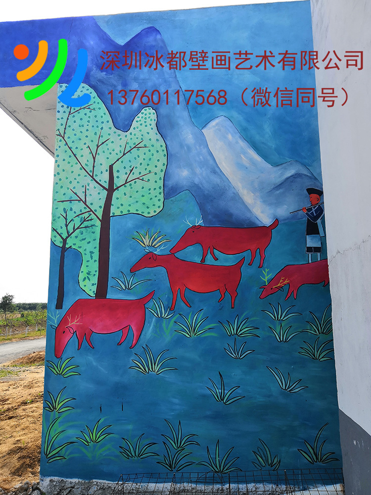 成都农村文化墙设计在一家农家小院的外墙,这户人家虽然只有一层小楼,大门却做得比较宽敞,院子干净整洁,主人待人热情,还借脚手架给我们画师使用,我们自然不能辜负主人家的好客之情,为其制作荷花鱼池,花朵随风摇曳,亭亭玉立在水光潋滟的湖面,鱼儿在其中穿梭畅游,时而顽皮地越出水面。平静宽阔的湖面宁静致远,衬托连绵起伏的远山,白云朵朵,棉花团似的排列,宁静祥和。彩绘把楼体装扮得有点世外桃源的清闲,雅致。侧面墙绘制了老农驱赶羊群回家的情景,天色已至黄昏,远方茅屋袅袅升起炊烟,该是家里晚餐快要上桌,脚步不经意加快。回头眺望每天光临的后山,深林的树木叠重,小路蜿蜒消失,依稀可见,羊群在前方走远,显然是吃饱了青草,想要赶紧回家安歇,老农不再停歇,径直沿着回家的小路走去。成都农村外墙手绘用故事性展现。冰都壁画公司创作