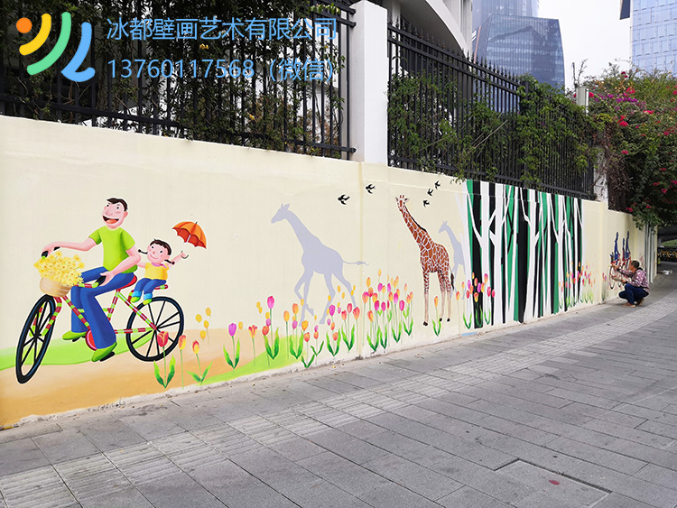 广州花都区彩绘围墙在路边,展现了冬去春来,草木争春,家庭出游,一幅和谐祥和的景象。表达了街道所推崇自然和人文环境的相辅相成。冰都壁画公司