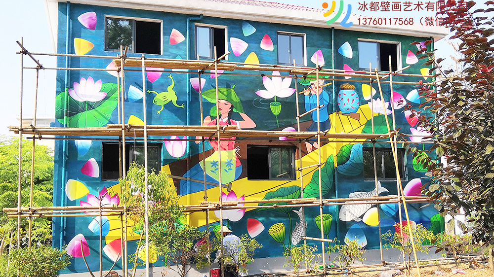 肇庆农村楼体彩绘通过荷花、鲤鱼、青蛙等元素的巧妙组合,不仅提升了乡间的颜值,更扩展了视野。未来,随着这一艺术形式的不断发展和创新,相信会有更多的作品涌现出来,绘就一幅幅绚丽多彩的乡村新画卷。运用手绘技艺,将自然景色、人物故事、民俗风情等融入其中,使之成为连接传统与现代、自然与人文的桥梁。不仅美化了乡村环境,更成为了传播文化、讲故事的载体。冰都壁画公司
