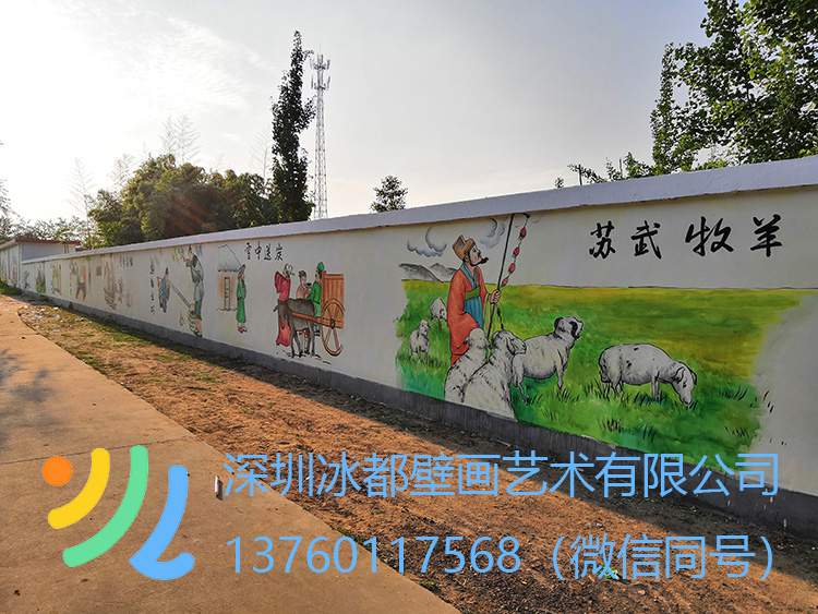 在佛山学校围墙上的某一段,我们以苏武牧羊的故事为蓝本,创作了一幅的手绘墙。画面中央,是身着汉服、手持节杖的苏武,他背对着茫茫北海,孤独而坚定地站立着。在他的前方,是成群结队的羊儿在草原上悠闲地吃草,远处则是波光粼粼的湖面和蓝天白云下的广袤天地。整个画面色彩鲜明,人物形象栩栩如生,仿佛让人穿越回了那个遥远的历史时代。