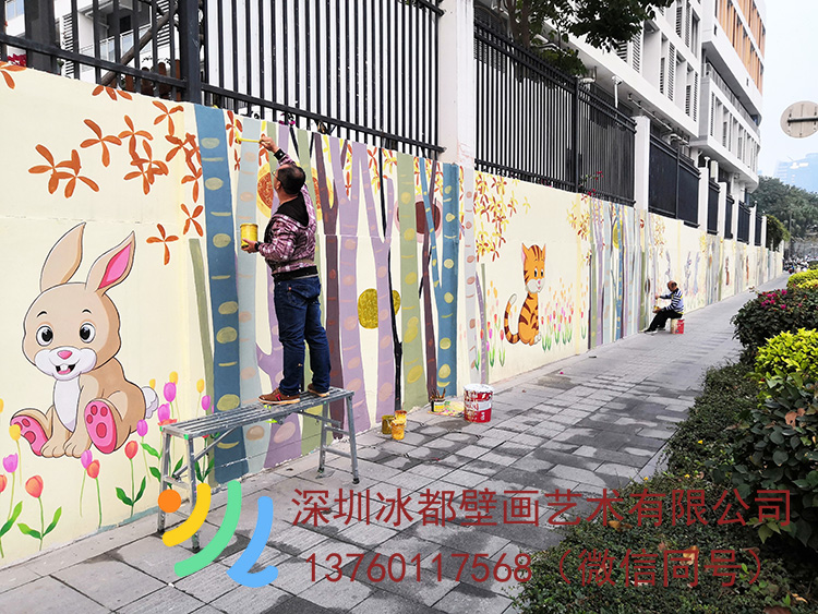 广州白云区学校围墙手绘既突出了学校所需要的浪漫主义色彩,又表现了人和自然和睦相处的氛围。和旁边的绿化带相呼应,形成相得益彰的街道文化,是美化城市的工程项目。冰都墙绘公司