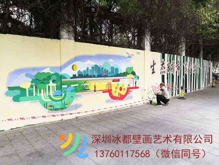 深圳街道彩绘围墙中,用浅蓝色的天空,各种明度不同的绿色系树木,蔚蓝的湖泊,金黄的马路和朱红的公园,组合形成有明度对比,有色彩互补,视觉柔和而不突兀的画面,并和谐地安置在汽车外形中,是把各种城市元素融洽地结合在一起的构图。为人潮涌动的人行道带来一抹清新雅致的风光。冰都墙绘公司