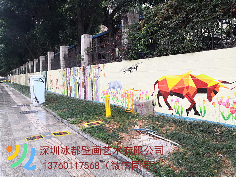 深圳南山围墙手绘在人行道的绿化带上呈现,在阳光下显得熠熠生辉。冰都壁画公司